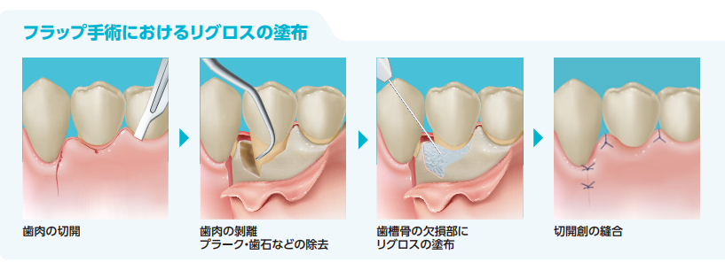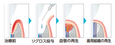 歯槽骨や歯周組織の再生を促進する薬剤としてリグロス(保険適応)とエムドゲイン(保険適応外)を使用します。リグロスはFGF-2(塩基性線維芽細胞増殖因子)というタンパク質を主成分としたもので、エムドゲインはエナメルマトリックスデリバティブ(EMD)というタンパク質を主成分とする材料です。いずれも細胞の増殖・遊走、血管新生、分化促進をする薬剤です。院長は幹細胞、幹細胞由来成長因子を用いた歯周組織再生の研究を行っておりましたので知識的には詳しいはずです。